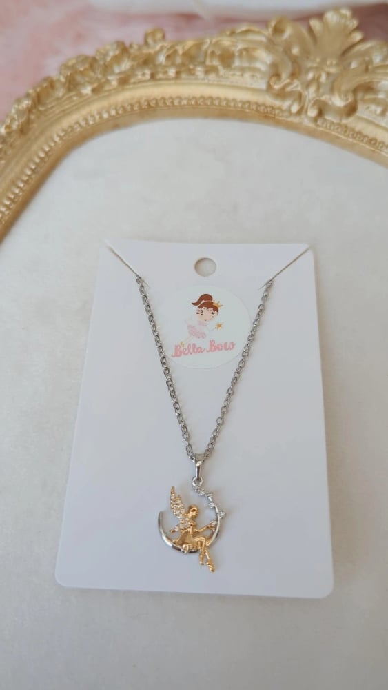 Embrace the enchantment of twilight with this beautifully crafted Moonlit Fairy Pendant Necklace. Featuring a delicate fairy perched gracefully on a crescent moon, this stunning piece blends silver and gold tones with sparkling crystal accents for a truly magical finish.