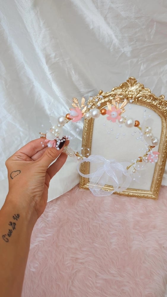Unleash your inner fairy with our Fairy Blossom Crown, a whimsical handmade headpiece featuring soft pink flowers, shimmering pearl beads, and golden fairy accents. Finished with a flowing sheer ribbon, it's lightweight and adjustable for a comfortable fit.